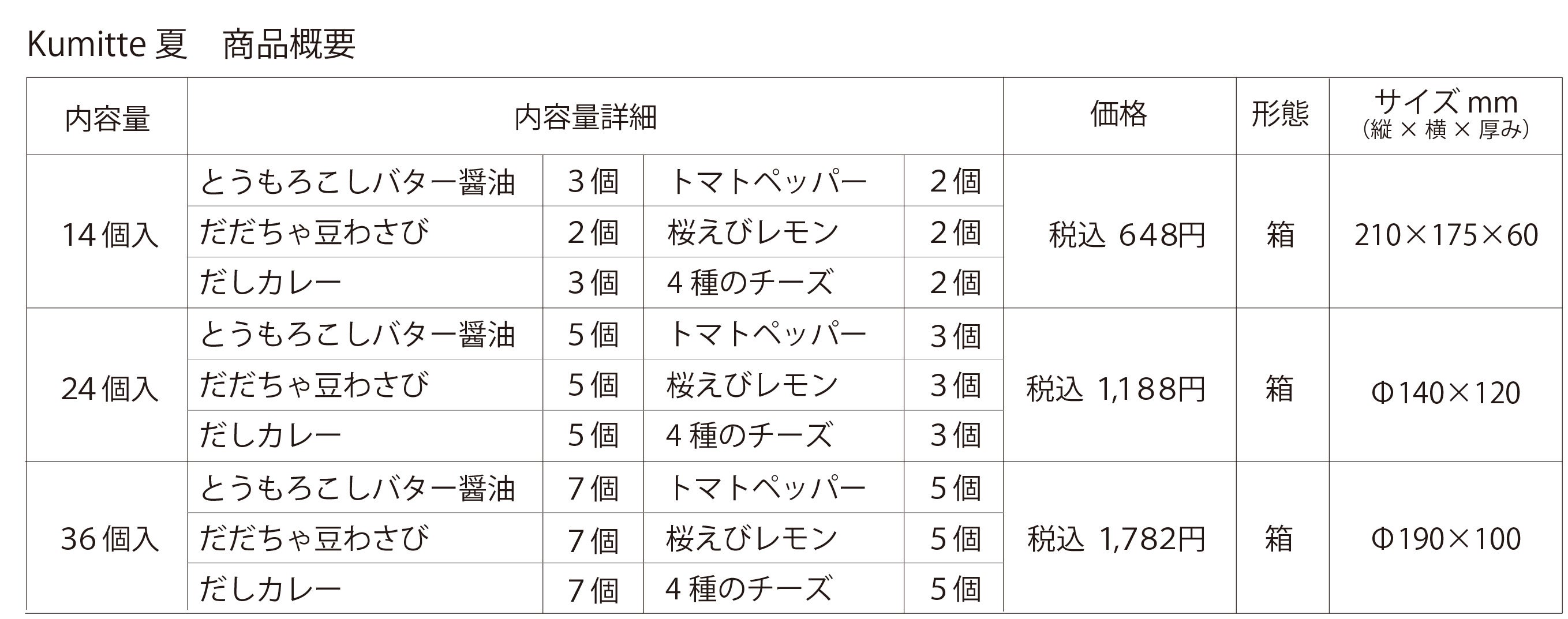 株式会社中央軒煎餅(本社:東京都板橋区/代表取締役:山田 宗)は、夏を感じる素材を組み合わせたおかき「Kumitte(クミッテ)夏」を、期間限定で販売いたしました。