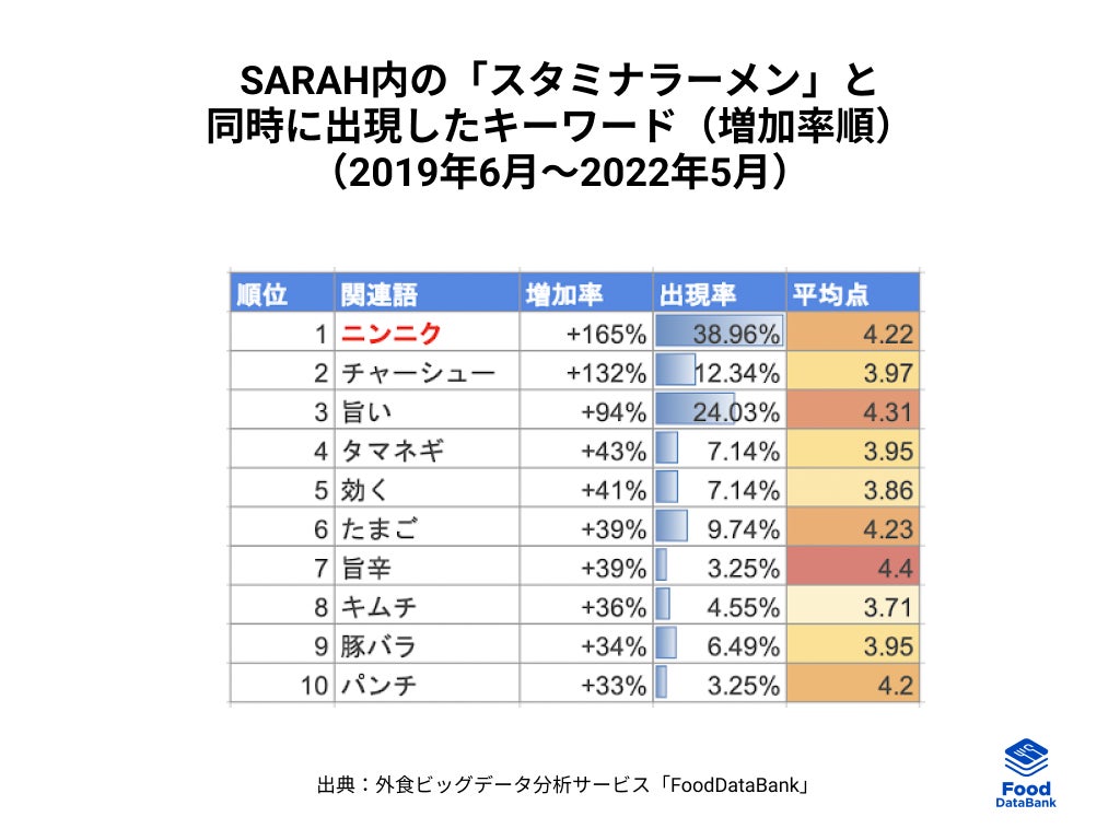 累計90万件以上のおいしい一皿が集まるグルメコミュニティサービス「SARAH」を運営する、株式会社SARAH(本社:東京・千代田、代表取締役:髙橋洋太)は、「外食トレンドニュース2022年6月号」を公開いたしました。ユーザーの投稿情報を外食ビッグデータ分析サービス「FoodDataBank」で分析したところ、スタミナラーメンの人気が日に日に高まっていることがわかりました。今回はスタミナラーメンを掘り下げてまいります。