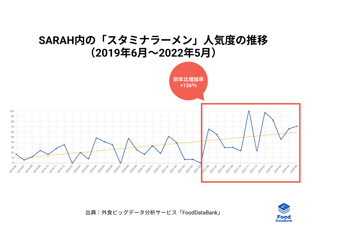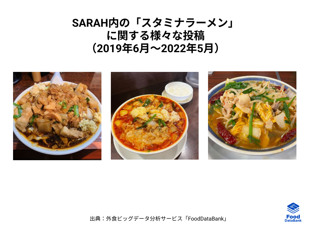 累計90万件以上のおいしい一皿が集まるグルメコミュニティサービス「SARAH」を運営する、株式会社SARAH(本社:東京・千代田、代表取締役:髙橋洋太)は、「外食トレンドニュース2022年6月号」を公開いたしました。ユーザーの投稿情報を外食ビッグデータ分析サービス「FoodDataBank」で分析したところ、スタミナラーメンの人気が日に日に高まっていることがわかりました。今回はスタミナラーメンを掘り下げてまいります。