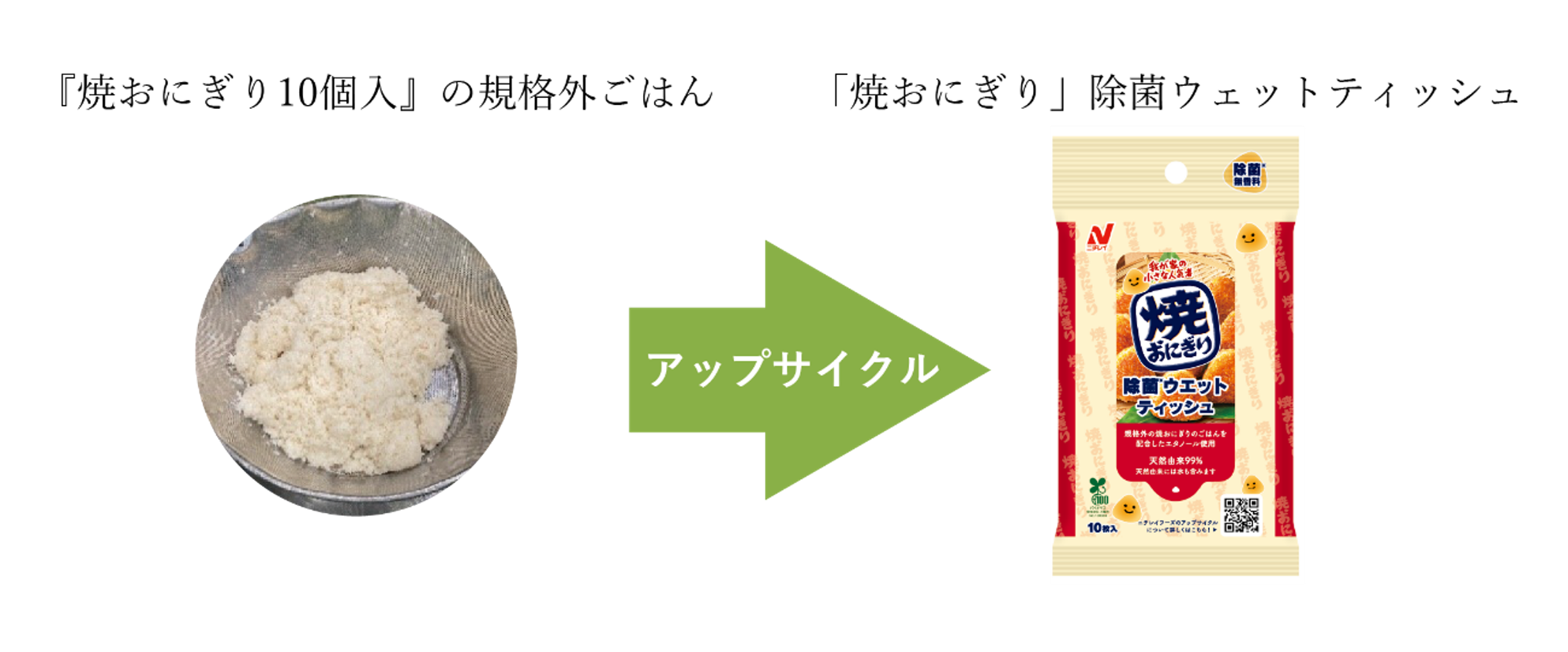 その第一弾として、食品・飲料の製造過程で出る規格外品・副産物や農産物の規格外品等を独自の発酵技術でアップサイクルさせることで注目を集める株式会社ファーメンステーション(代表取締役:酒井里奈、以下ファーメンステーション)と協業し、当社のロングセラー商品である『焼おにぎり10個入』の規格外ごはんを除菌ウエットティッシュへ生まれ変わらせ、提供いたします。