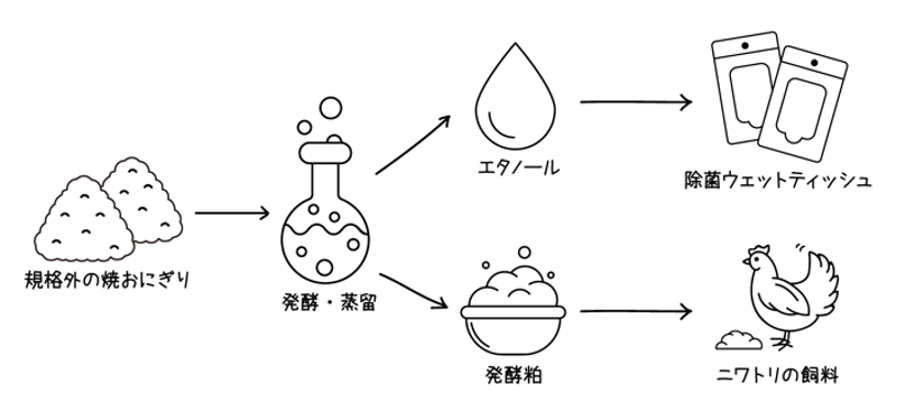 『焼おにぎり10個入』の規格外ごはんはファーメンステーション独自の技術で発酵・蒸留され、その結果エタノールと発酵粕が生成されます。エタノールは除菌ウエットティッシュに、発酵粕はニワトリの飼料へと余すことなく活用されます。