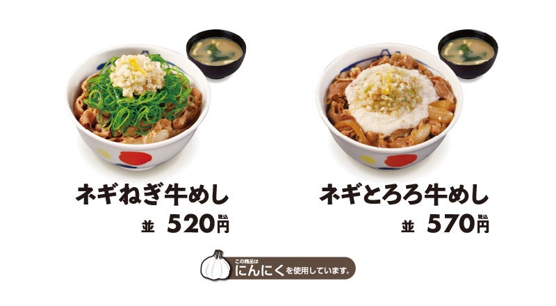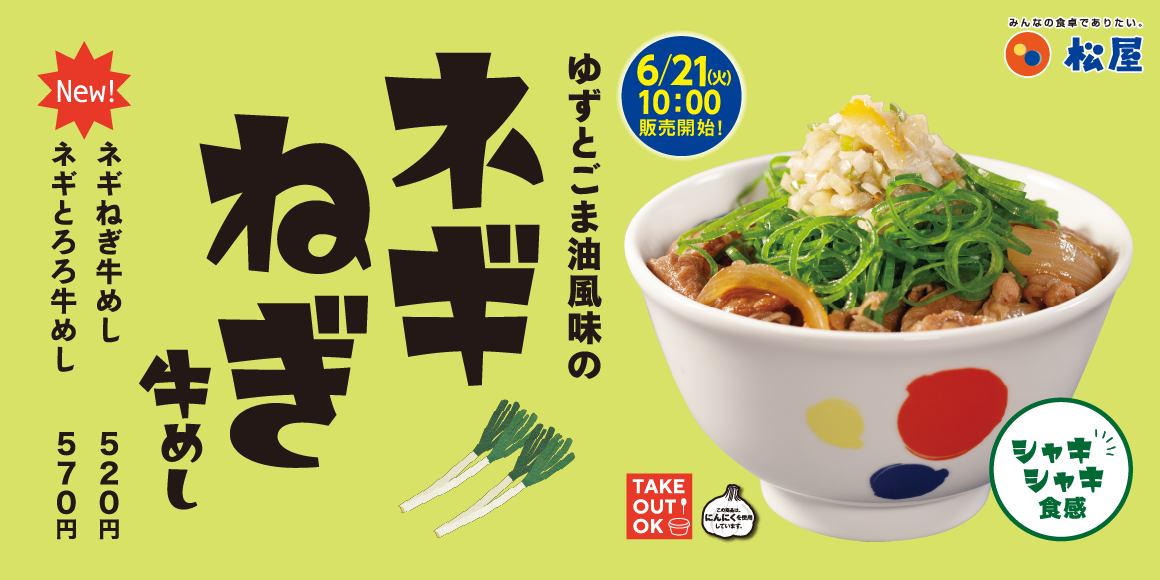 | 商品名 ネギねぎ牛めし 520円 ネギとろろ牛めし 570円 ネギダレ 180円 ※お持ち帰りいただけます。お持ち帰りにみそ汁は付きません。 お持ち帰りの場合、みそ汁は別途60円でお求めいただけます。 ※全て税込み価格です。また、店内・お持ち帰りの税込価格は同一です。 発売日 2022年6月21日(火)午前10時 ~ |