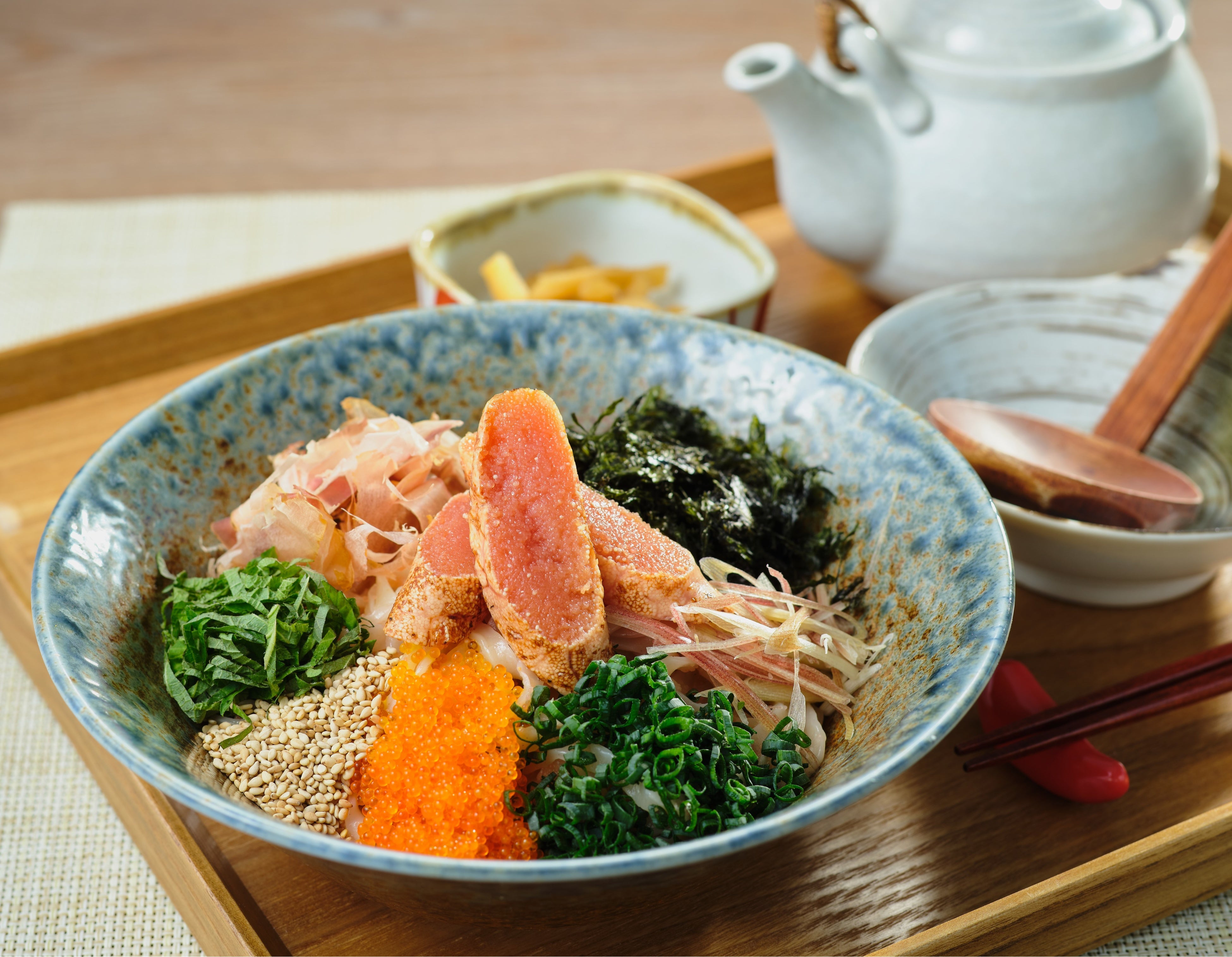 7種類の薬味(⼤葉/とびこ/かつお節/みょうが/ねぎ/海苔/ごま)と冷たいお出汁で。