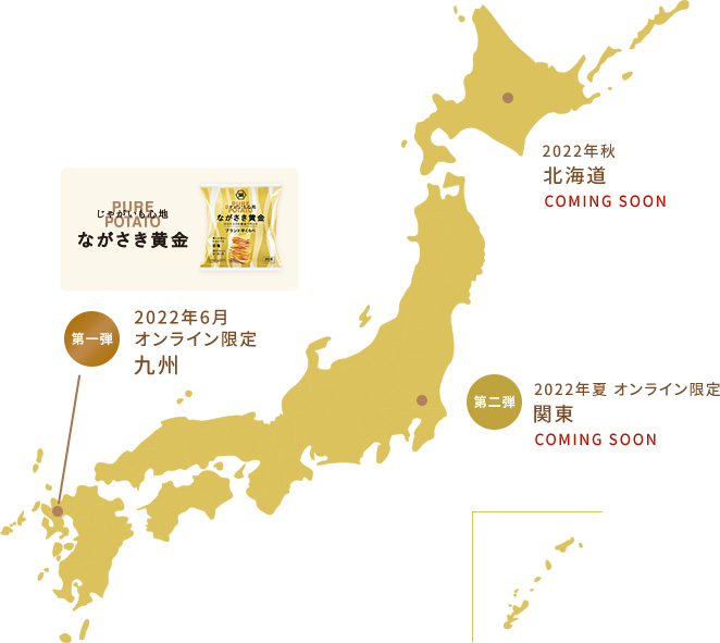 4年目を迎える今回の「ブランド芋くらべ」は、オンラインショップ限定シリーズをラインナップに加えてグレードアップ。北海道で収穫されるブランド芋だけでなく、九州から北海道へと北上しながら、まるで桜前線のように美味しい旬を迎える“じゃがいも前線”に合わせて各地のブランド芋をお届けします。その第1弾として発売されるのが九州編「じゃがいも心地 ながさき黄金」です。