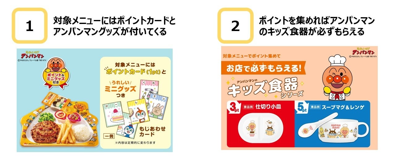 | 【キッズメニュー各種がお得になるチャンス!】 アンパンマンマークの商品(サイドメニューを除く)が、クーポンで99円(税込109円)に ガスト・バーミヤン・夢庵・ステーキガスト・グラッチェガーデンズで、ご利用いただけます。 <キッズ99円(税込109円)キャンペーンURL:https://www.skylark.co.jp/kids99cp/index.html> |