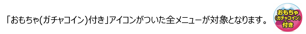 | 【“妖怪ウォッチ♪”のキャラクターが妖怪図鑑シートになって登場】 「おもちゃ(ガチャコイン)付き」アイコンがついた対象商品ご注文で、もれなくゲット!(※) ガスト・バーミヤン・しゃぶ葉・ジョナサン・夢庵・ステーキガストにて、配布いたします。 <妖怪ウォッチ♪キャンペーンURL:https://www.skylark.co.jp/yo_kai_watch/index.html> ※テイクアウト・宅配では、ブランドにより対象メニューやカプセルトイの付属有無が異なります |