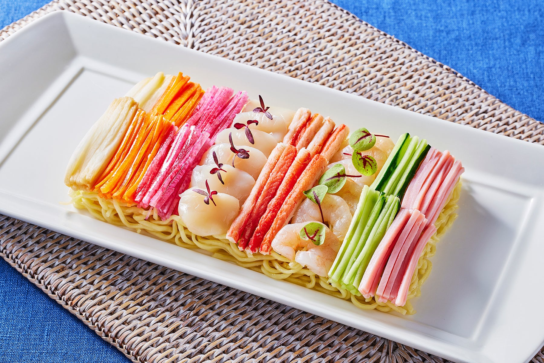 中でも、新メニューの「冷やしヌードル」は、長芋、人参、紅芯大根、ホタテ、蟹、海老、胡瓜、ハムが中華麺を覆うように並べられ、彩りの美しさに加え、海鮮と野菜の食感の違いがお楽しみいただける一品です。さっぱりとしたたれをたっぷりかけて、よく混ぜて食べるのがおすすめです。