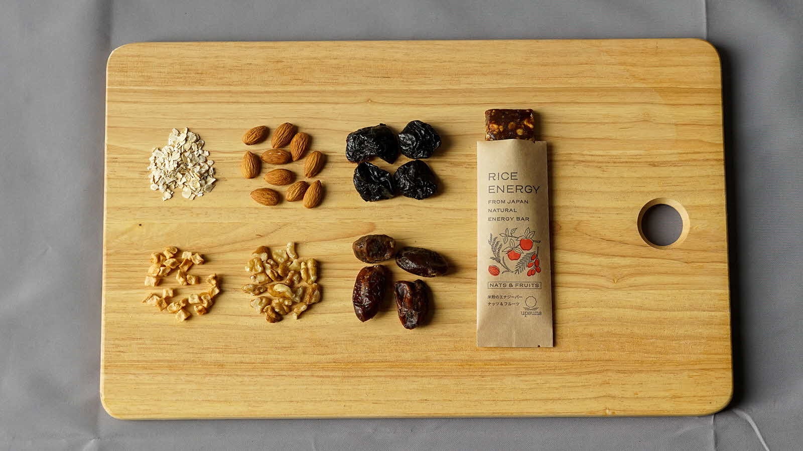 ナッツの香ばしさとフルーツの爽やかさがマッチした、飽きのこない美味しさが特徴のライスエナジーバーです。