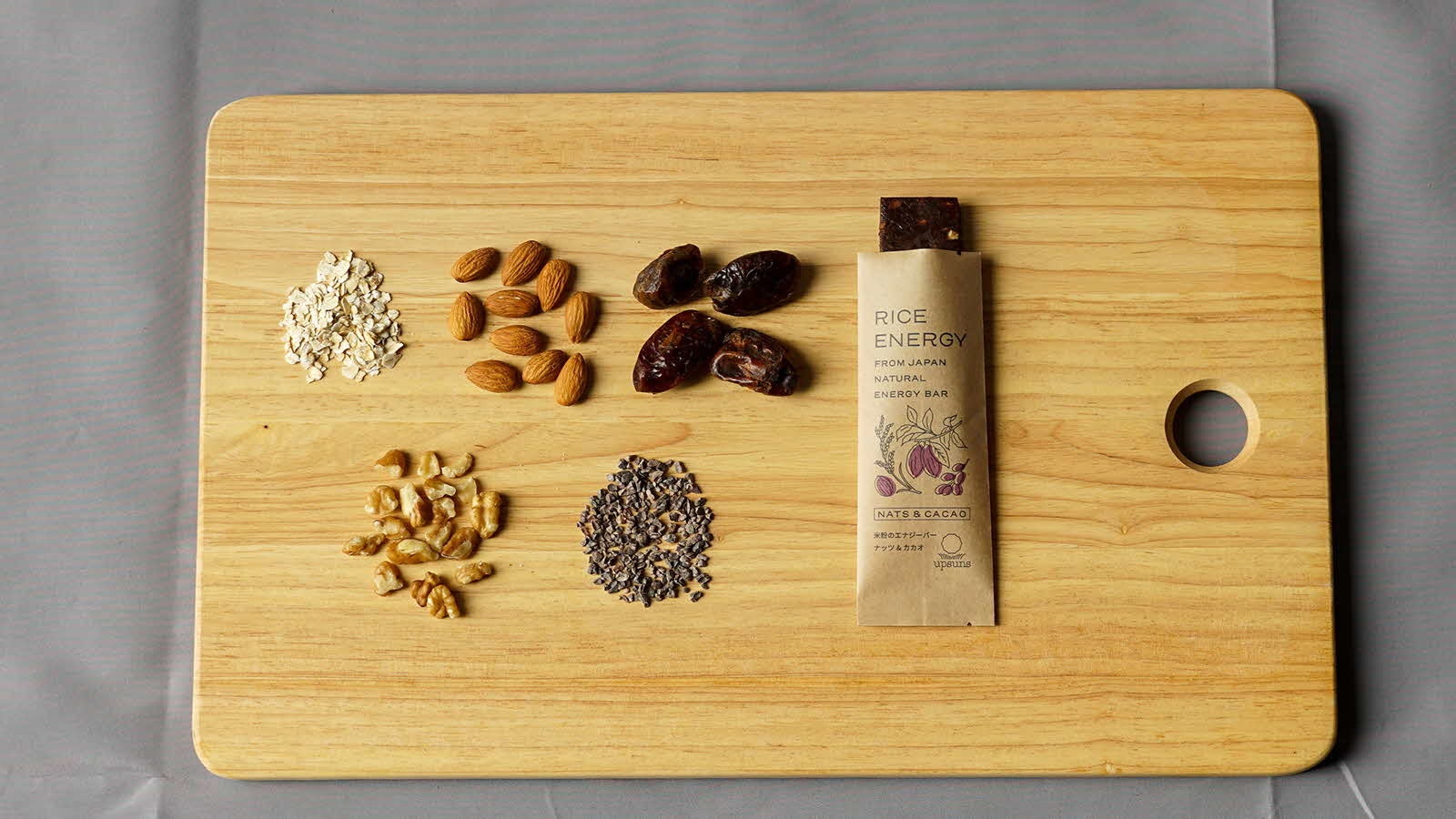 砕いたナッツとほろ苦いカカオが深い味わいを引き出し、食べ応えのあるライスエナジーバーです。