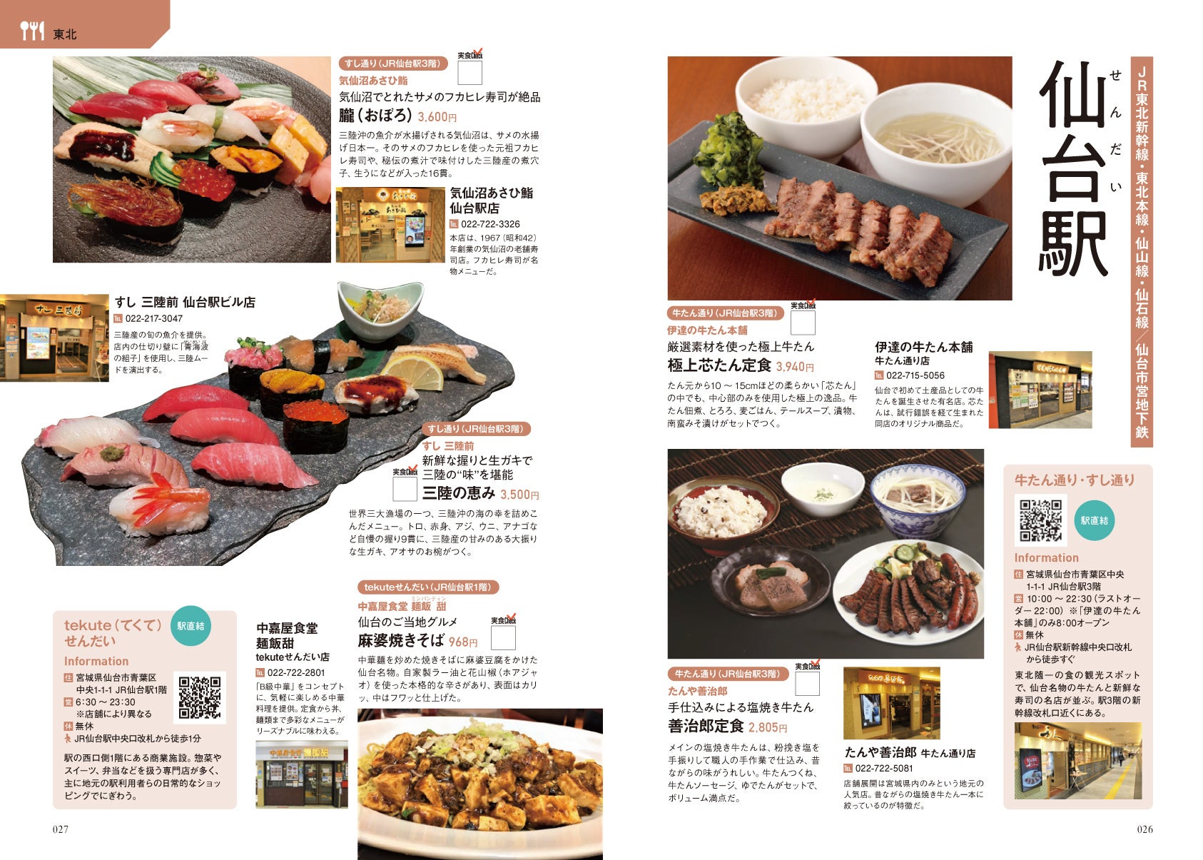 探しやすいエリア別の章立てで、駅ごとに駅ビルと味わえるご当地グルメを紹介。旅の途中で味わいたいご当地グルメやご当地食材を使ったメニューに絞り込んで、迫力あるメニュー写真とともに情報を取り上げています。各メニューには実食Check欄を記載、そのほか感染症などで変わりやすい営業時間などを確認できるよう、駅ビルのホームページへとリンクしたQRコードを掲載し検索性を高めています。