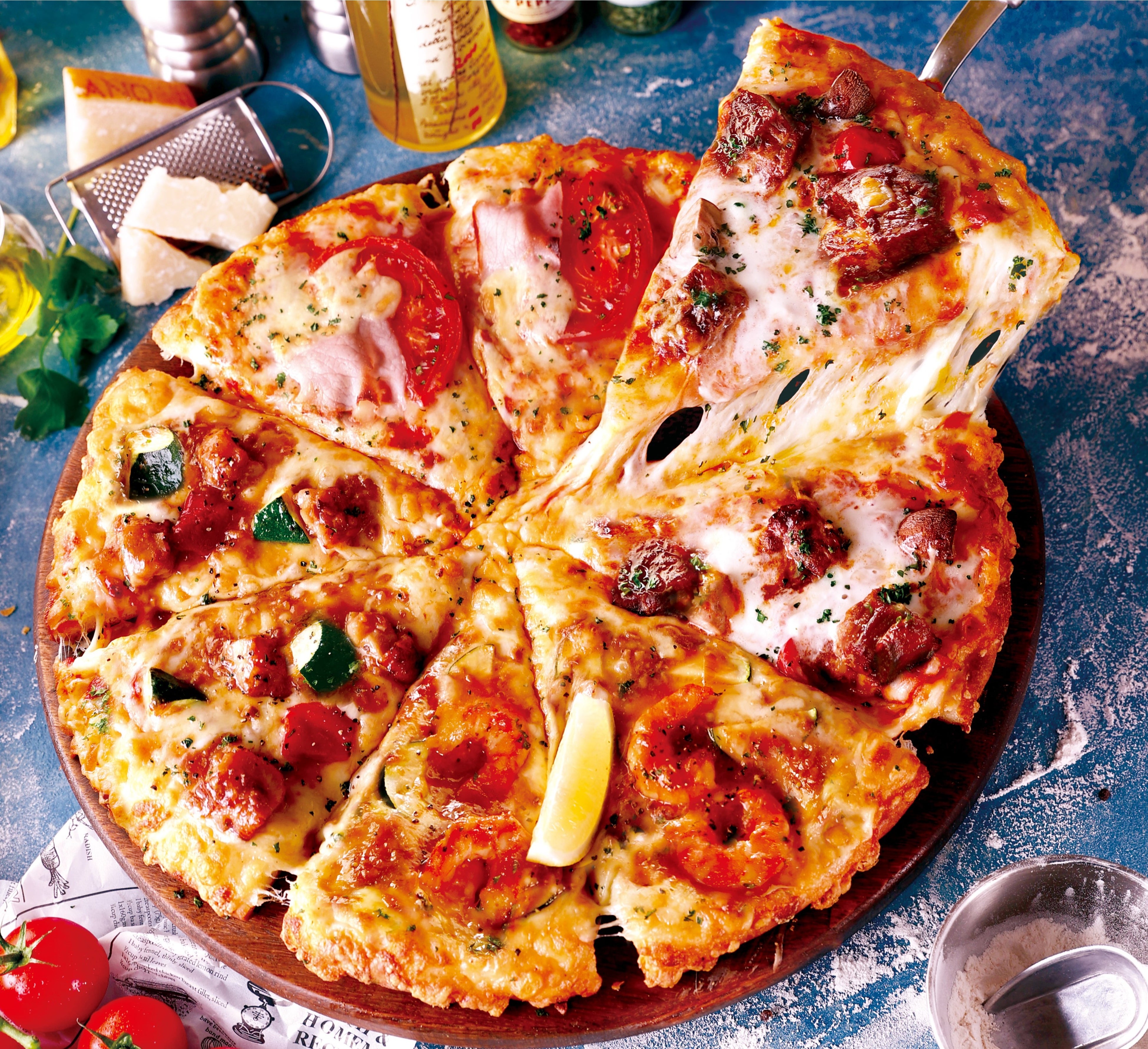 お選びいただけるクォーターピザは5種類。累計販売枚数1500万枚(*)を突破したよくばりシリーズから「バターチキンカレーのよくばりクォーター」と「よくばりクォーター」、35周年記念の期間限定ピザ「ゲッツ&エビマヨクォーター」など、バリエーション豊かなクォーターピザがラインナップ。