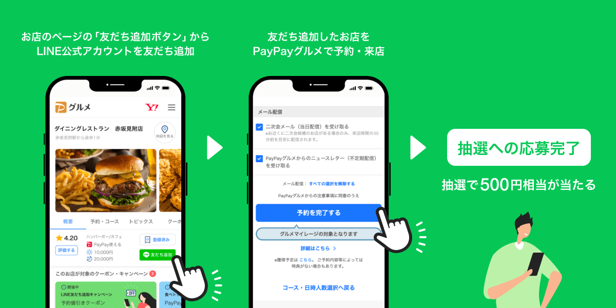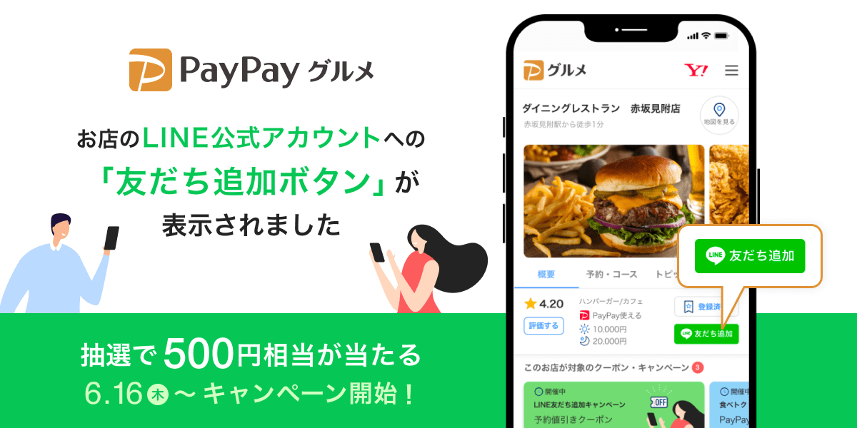 本機能の提供開始にあわせて、本日6月16日(木)より8月31日(水)までの期間中、加盟飲食店をLINEで友だち追加し、追加したお店を予約・来店したユーザーに、「PayPayグルメ」で使える500円相当の予約値引きクーポンを抽選で配布するキャンペーンを3回にわたって実施します。