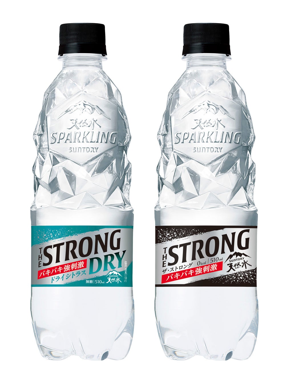 清冽なおいしさの「サントリー天然水」に、ブランド史上最高レベルのガス圧を加えた強炭酸の中味に、ぐっと立ち上がる柑橘系の鋭い香りを加えました。飲んだ瞬間、喉に突き刺さるような強刺激と、口の中に残らないシャープでキレのある香りで、爽快感が楽しめます。パッケージでは、おなじみの「バキバキ」に尖ったボトルを採用。さらに、キレのある柑橘系の香りを、ベースカラーのメタリックな青緑色と「ドライシトラス」というネーミングで表現することで、爽快なリフレッシュ感が伝わるパッケージへと仕上げました。
