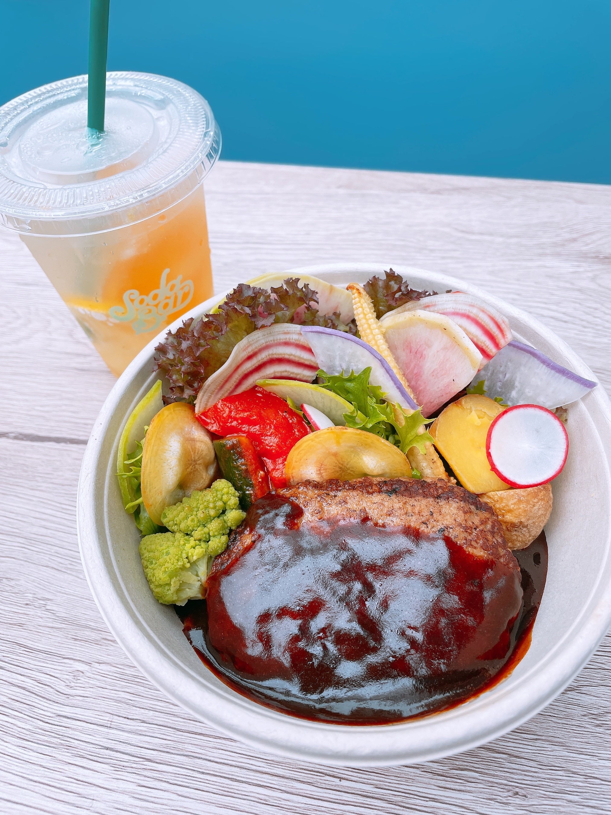 合い挽き肉を使用し、じっくり煮込んだデミグラスソースにはSODA BAR人気No. 1のフルーツソーダにも使用しているシロップを使いました。添えられた西洋野菜と一緒にお楽しみください。