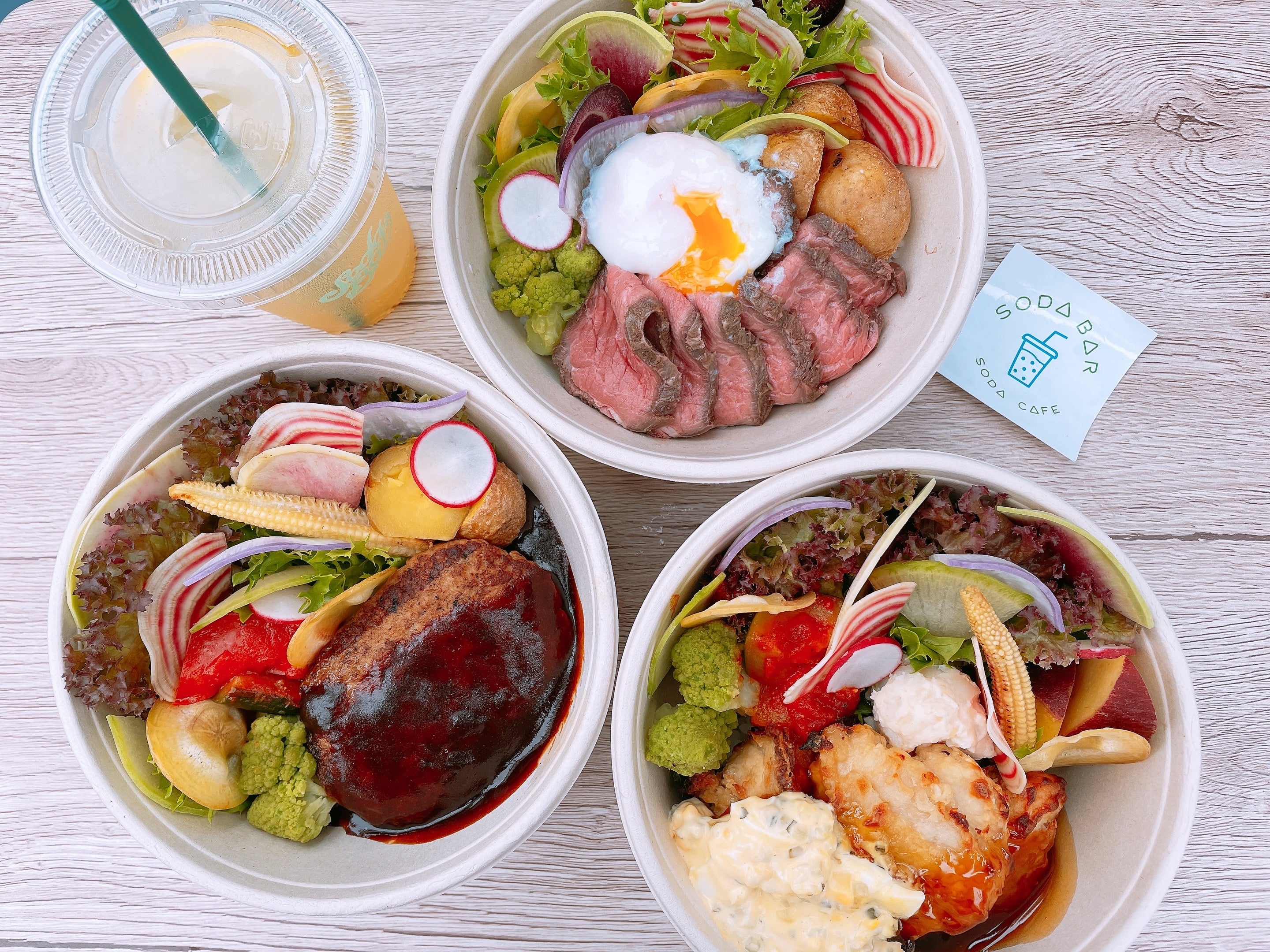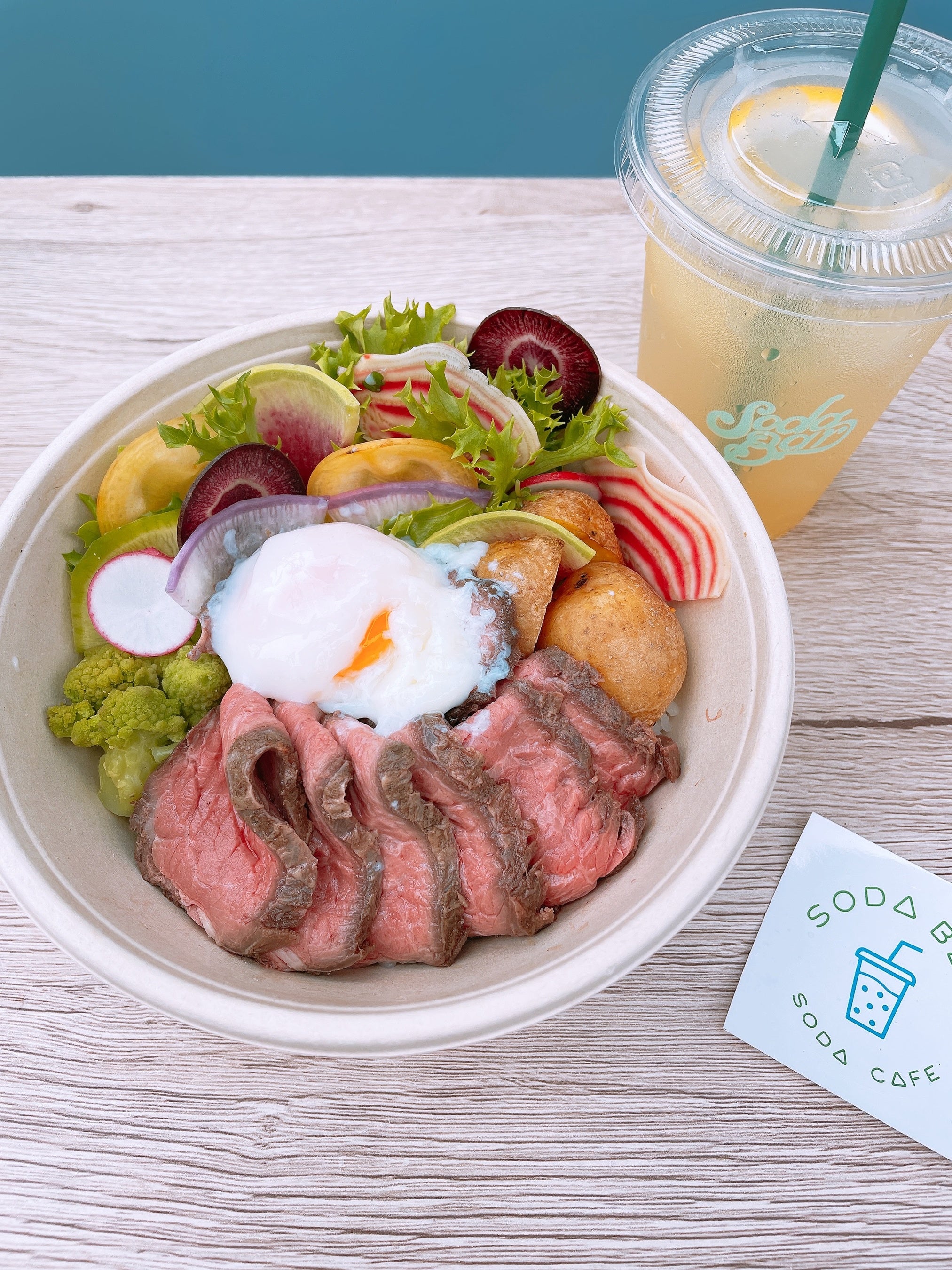 北海道産の牛もも肉を「低温真空調理」でなめらかな食感に仕上げたローストビーフを使い、7種類の西洋野菜を添えたSODA BARオリジナルのローストビーフボウルです。オープンを記念とした限定商品ですので、ぜひこの機会にお買い求めください。