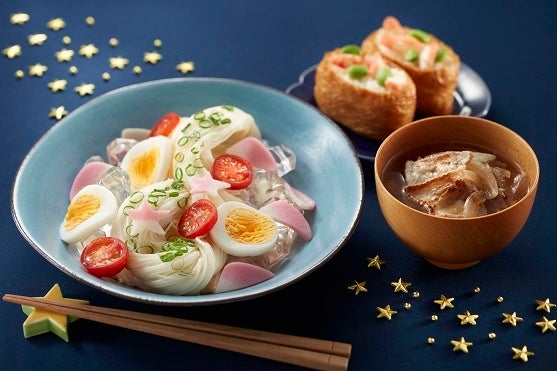 主菜は、七夕の天の川をイメージしたそうめんにかまぼこやゆで卵で飾り付けをし、豚肉入り和風つけ汁でお召し上がりください。副菜は、お子さまも作りやすく見た目もカラフルな具材をのせた、いなり寿司です。