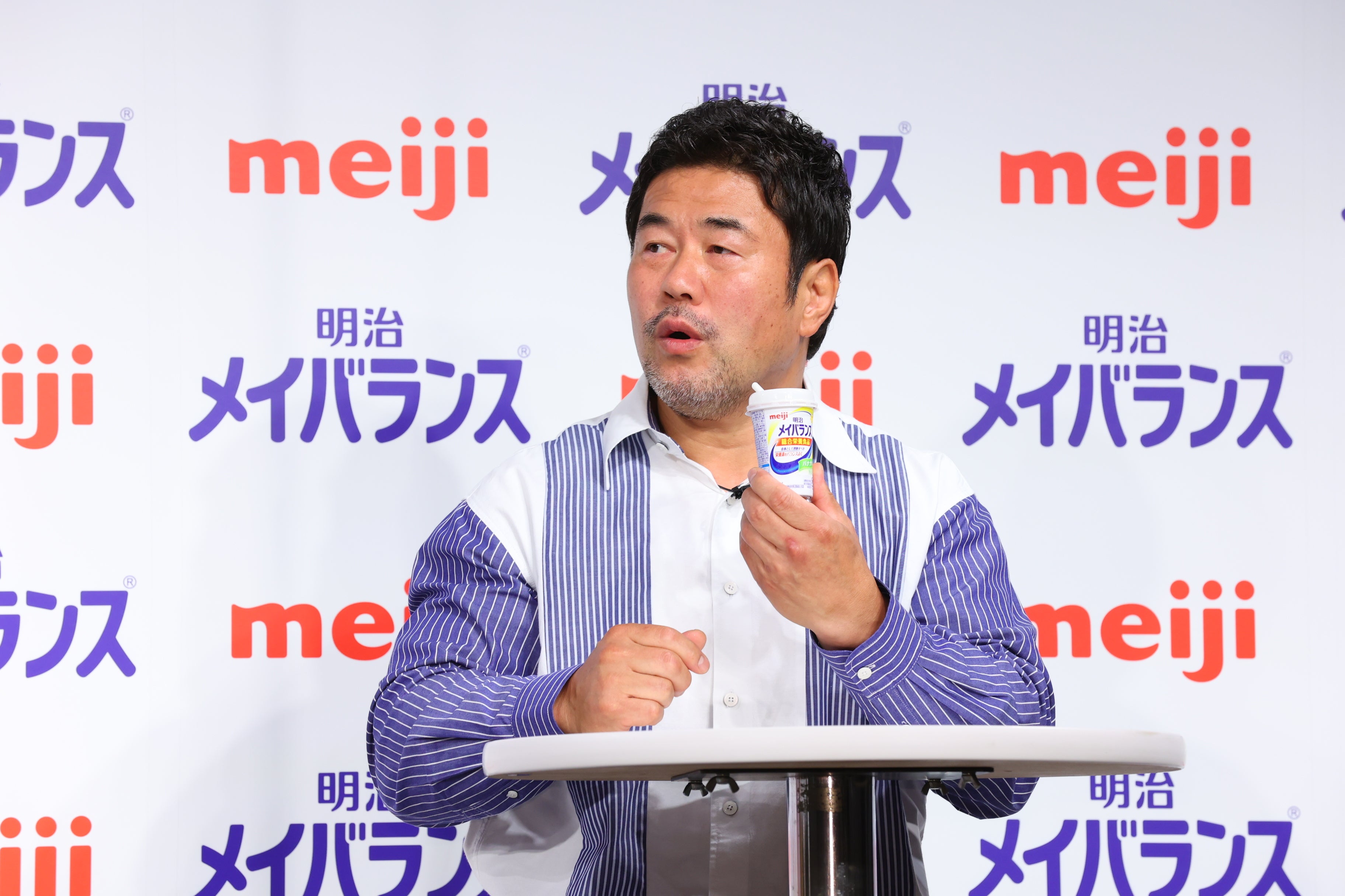 株式会社 明治 グローバルニュートリション事業本部長 大石 昇吾から明治メイバランスの商品紹介及び、許可取得の経緯についての説明のあと、スペシャルサポーターの佐々木 健介さん、よゐこ 有野 晋哉さん、濱口 優さんが登場しました。