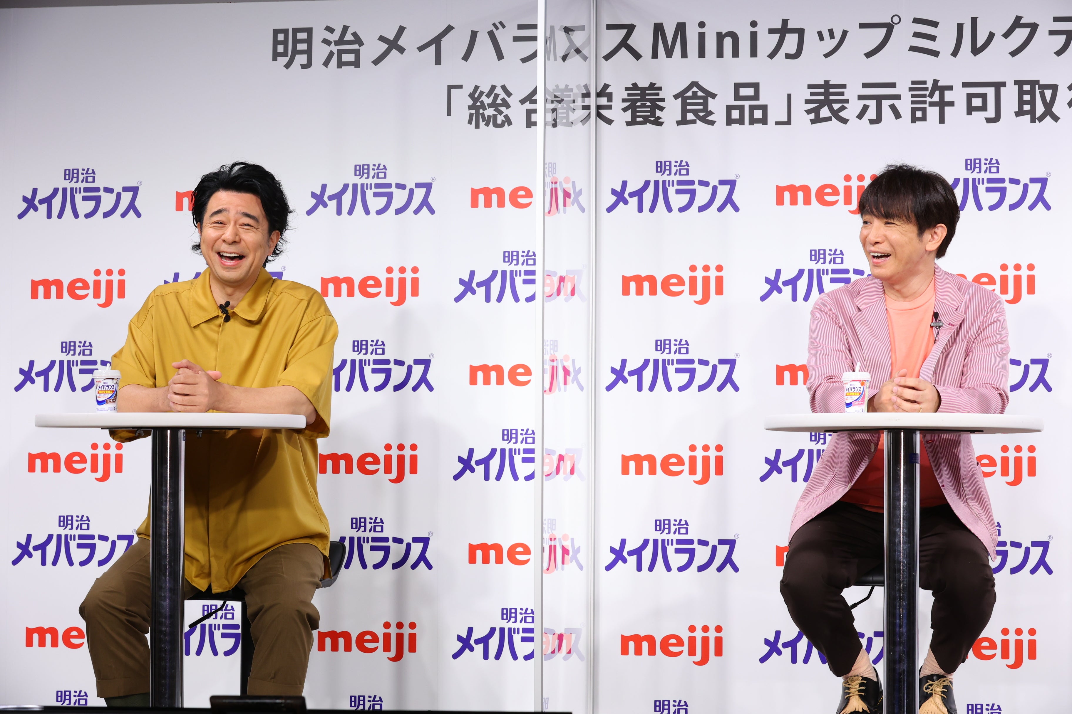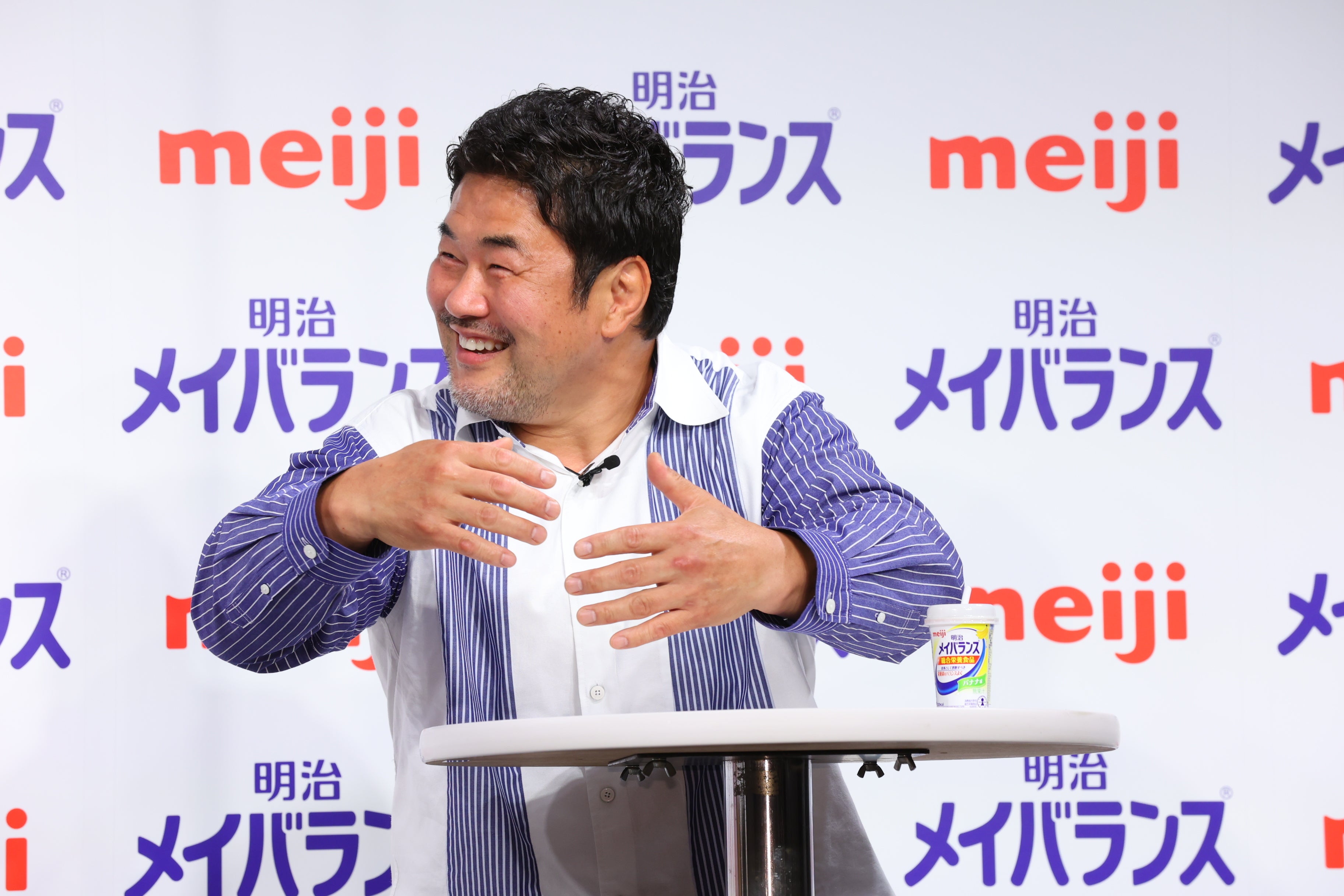 試食後のトークセッションで、ご自身やご家族が食事を普段のように摂れないときに工夫されていることや、困ったエピソードについて尋ねられた佐々木さんは「皆さん知っている通り、うちの妻って元気じゃないですか。でも妻にも体調が悪い時があって、何か作ろうかと言っても(体調が悪いから)食べられなくて。どうすればいいか分からない時が結構あるんですよね。そういうときに少しの量で栄養がまとめて摂れるメイバランスがあったらいいなと思いましたね。」とコメント。濱口さんは「奥さんが体調崩した時、何か作ってあげたいですけど、僕料理できないですから。これが(メイバランスが)家にあったら嬉しいです。助かります。」と語り、一方有野さんは明治メイバランスMiniカップが1年間の常温保存ができることに関して「防災バッグにも入れることができるってことですよね。」と話し、ご家族とのエピソードやメイバランスが欲しいシーンを明かしました。