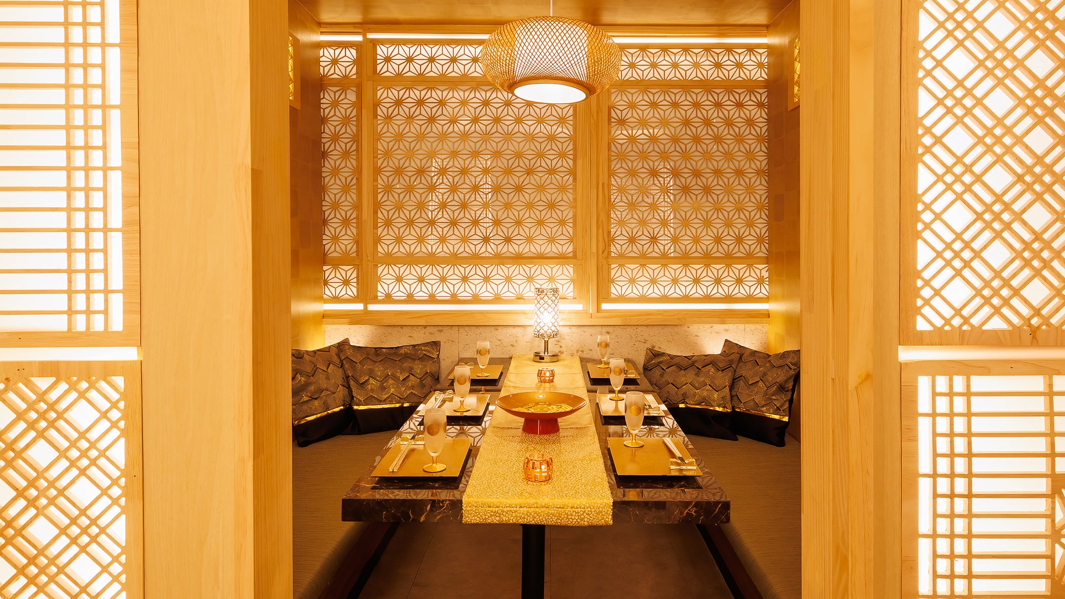 伝統芸能の組子で囲まれた個室空間。壁紙は金色の市松模様であしらわれ、煌びやかな空間でありながらも温かみのある照明が優しく包み込み落ち着く雰囲気を演出。