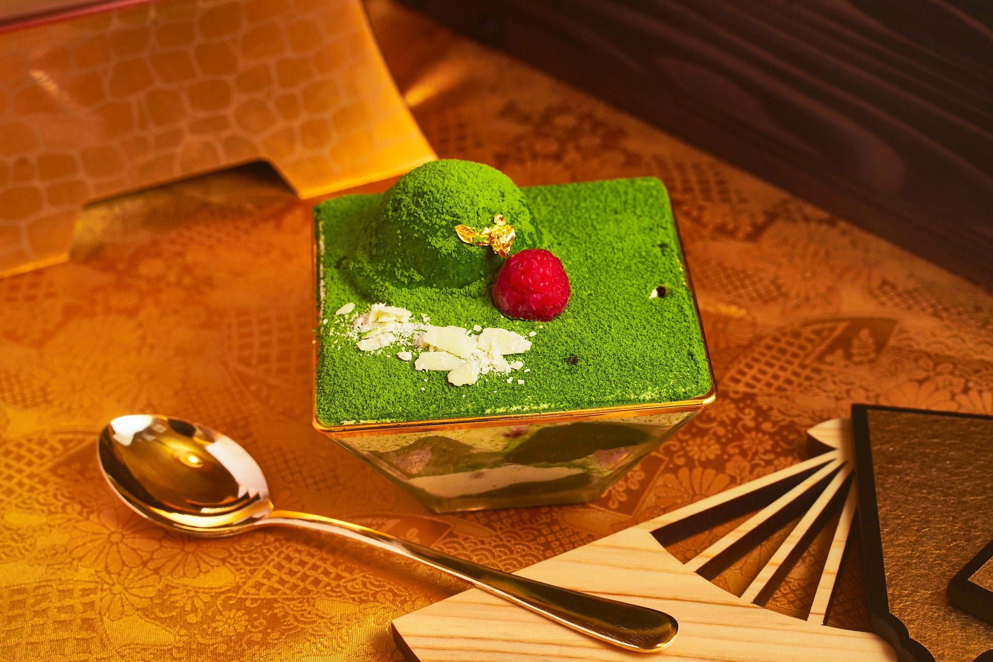 宇治産抹茶の自家製濃茶アイスとホワイトチョコ・ベリーのパフェ。