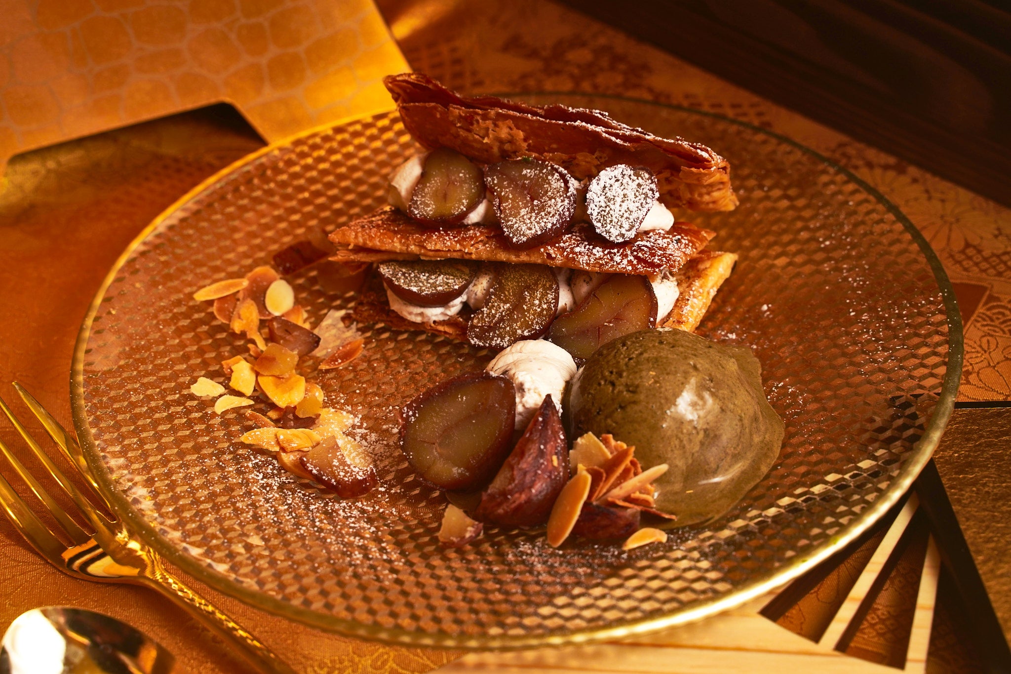 九州産の和栗とマスカルポーネクリームを自家製ミルフィーユパイでサンドした一品。