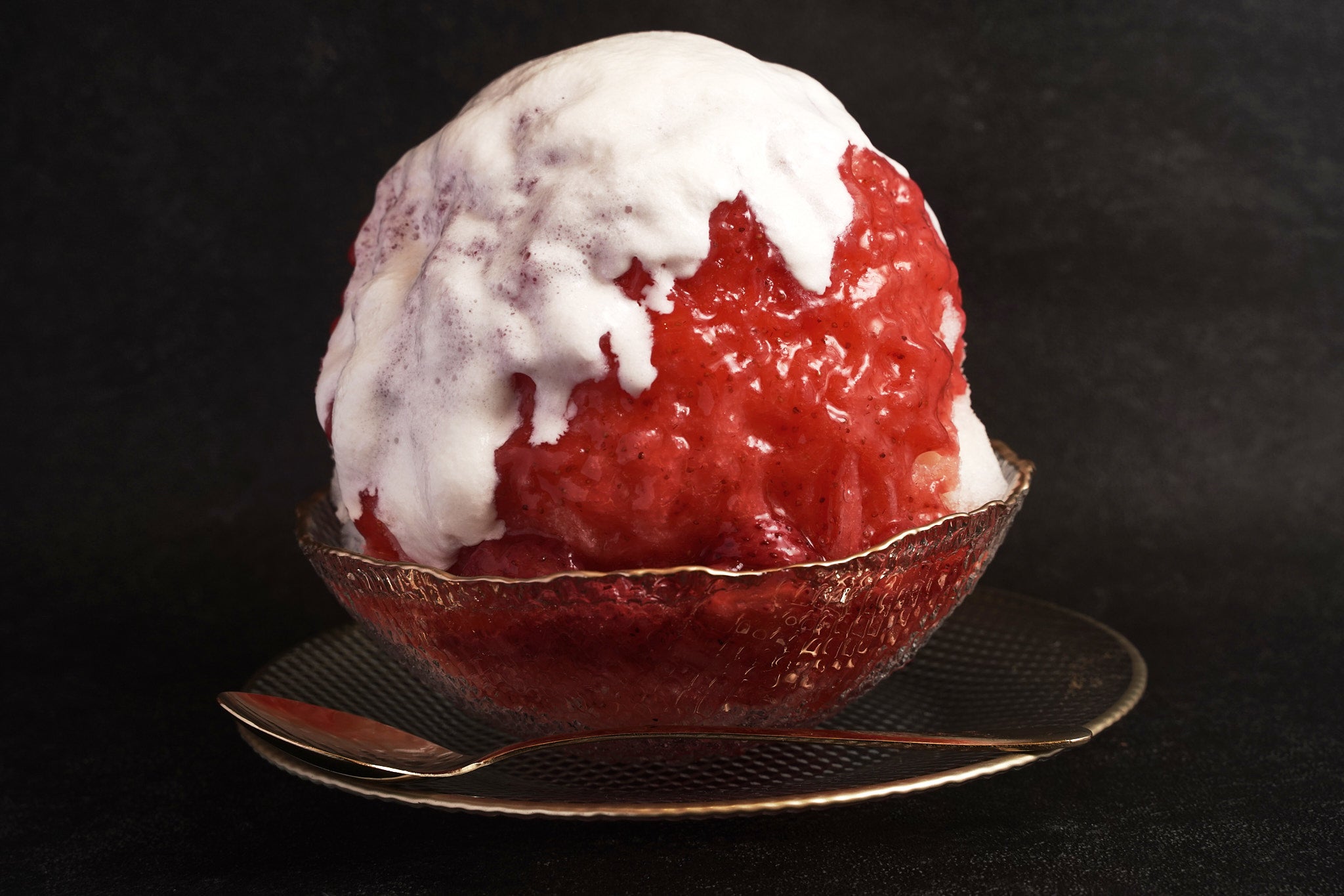 静岡県産紅ほっぺのいちごシロップと自家製和三盆ミルクのかき氷。