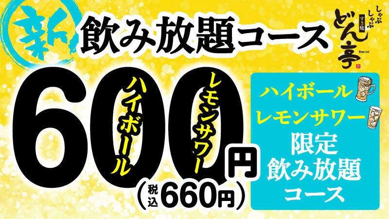 株式会社アークミール(本社:埼玉県さいたま市、代表取締役社長:柳 先)が運営する『しゃぶしゃぶすき焼どん亭』(以下「どん亭」)では、2022年6月20日(月)から、新飲み放題コースとなる「ハイボール・レモンサワー限定飲み放題コース」を販売開始いたします。