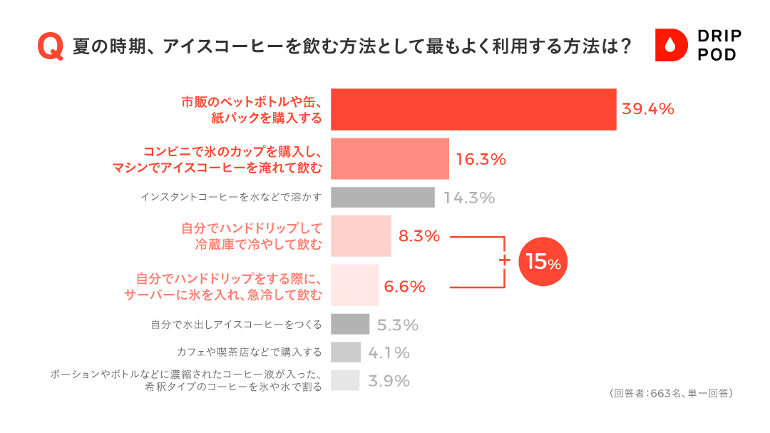 夏の時期、アイスコーヒーを飲むときに最もよく利用する方法を聞いたところ、1位は「市販のペットボトルや缶、紙パックを購入する」(39.4%)、2位は「コンビニで氷のカップを購入し、マシンでアイスコーヒーを淹れて飲む」(16.3%)、3位はインスタントコーヒーを水などで溶かす(14.3%)となりました。一方で、4位には「自分でハンドドリップして冷蔵庫で冷やして飲む」(8.3%)、5位は「自分でハンドドリップする際にサーバーに氷を入れ、急冷して飲む」(6.6%)と、自宅でハンドドリップする方も約15%いる結果が分かりました。