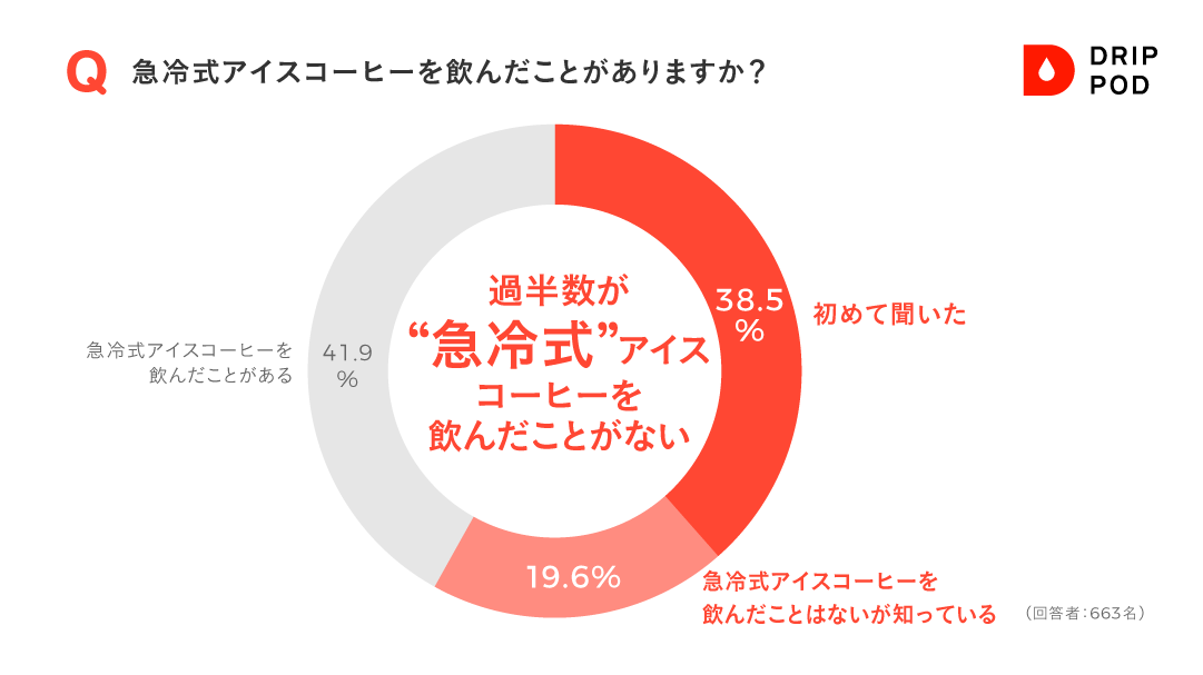 しかし、今回の調査では「“急冷式”アイスコーヒーを飲んだことがある」と回答した人は41.9%と半数にも満たない結果になりました。「飲んだことはないが知っている」(19.6%)、「初めて聞いた」(38.5%)と回答した方は合わせて58.1%となり、“急冷式”アイスコーヒーを飲んだことがない方が半数以上となりました。