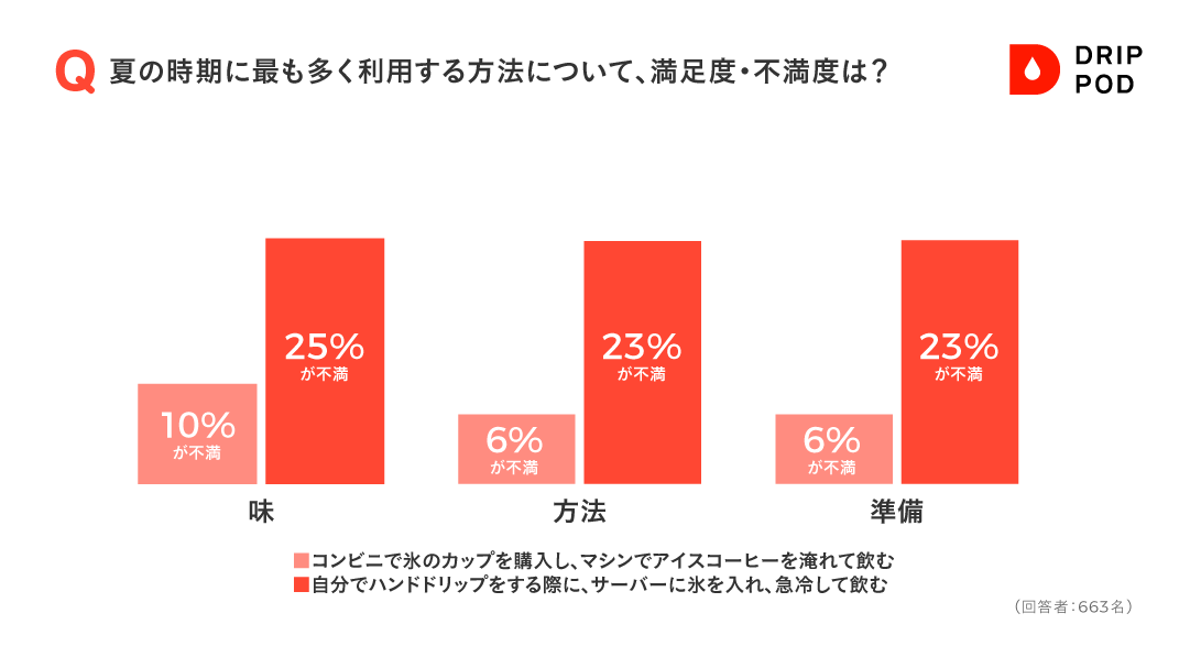 特に差が大きかった項目は「味」「方法」「準備」で、いずれも満足度は75%以上と高いものの、コンビニコーヒーの方が高い満足度になった理由として、自宅でハンドドリップをして“急冷式”アイスコーヒーを淹れることは味の調整や、準備が大変と感じ、美味しいアイスコーヒーを上手く抽出できていないのではないかといった消費者の課題が考察されます。