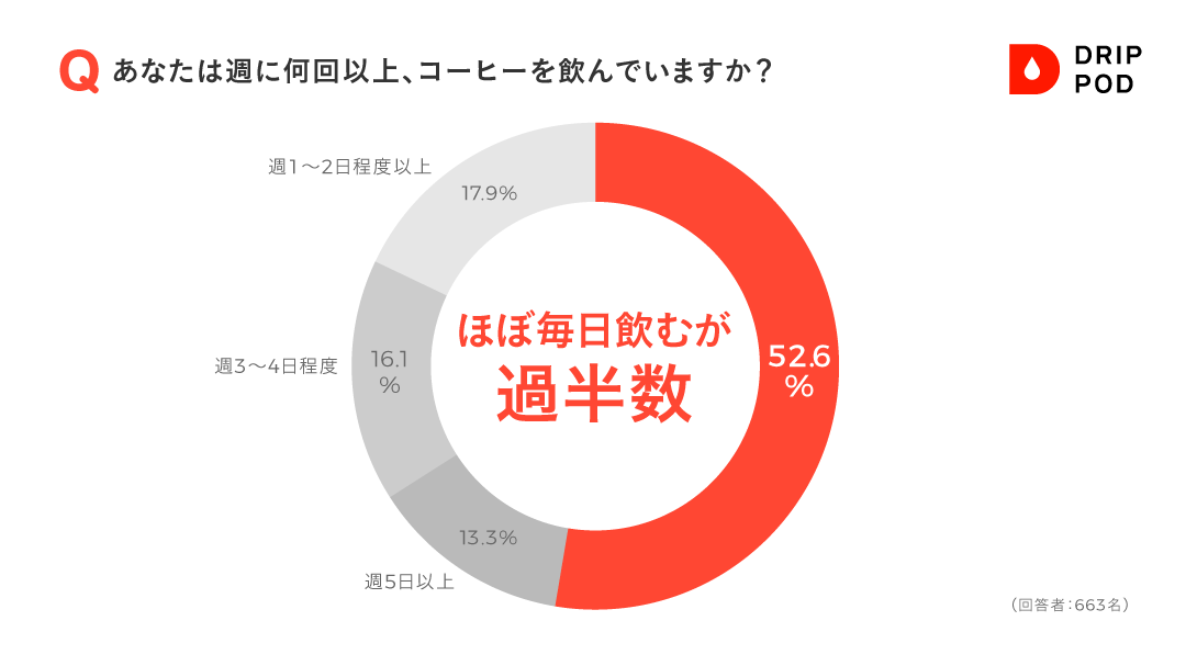 コーヒーを週に何回飲むかを聞いたところ、ほぼ毎日飲むと回答した方が半数以上(52.6%)となる結果に。コーヒーを飲む機会が非常に多いことが調査結果から分かりました。