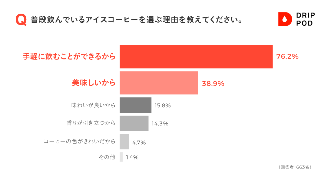 普段飲んでいるアイスコーヒーを選んでいる理由は1位が「手軽に飲むことができるから」(76.2%)。2位は「美味しいから」(38.9%)、3位は「味わいが良いから」(15.8%)、4位は「香りが引き立つから」(14.3%)と、手軽さを重視する方が圧倒的多数を占めるということが分かりました。