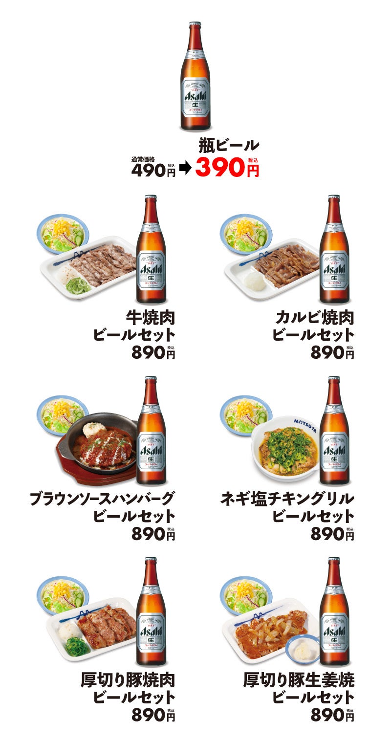 | 商品名 アサヒスーパードライ 490円 → 390円 ビールセット各種 890円 ※お持ち帰りの販売はございません。。 ※販促期間中は生ビール、ハイボールの販売はいたしません。 発売日 2022年6月21日(火)午前10時 ~ 対象店舗 一部店舗を除く全国の松屋 |