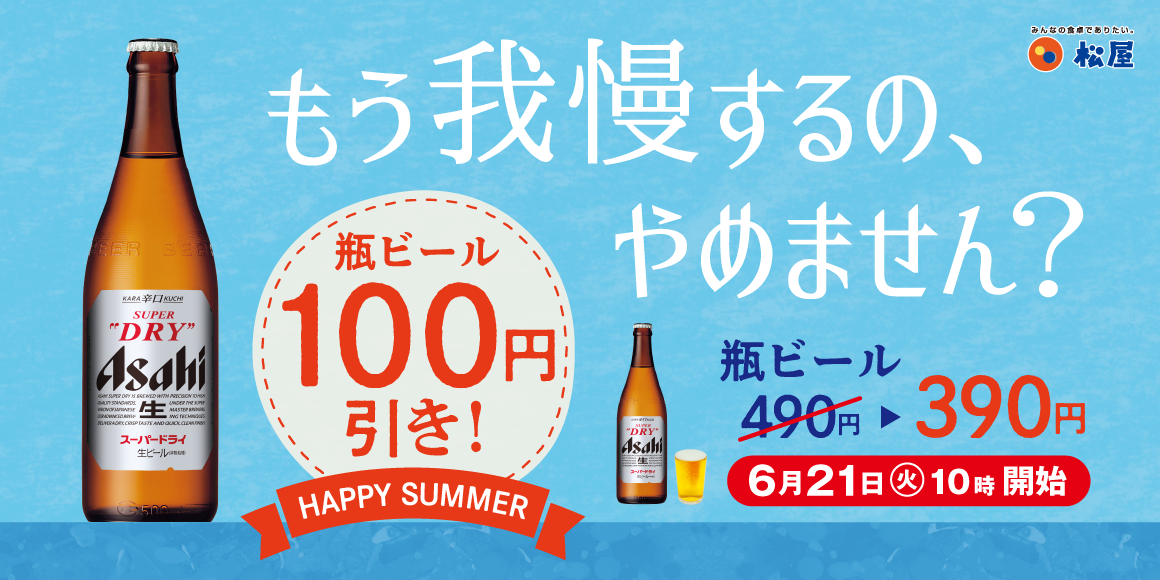 このたび松屋フーズ(本社:東京都武蔵野市、代表取締役社長:瓦葺一利)では、牛めし・カレー・定食・その他丼の「松屋」におきまして、2022年6月21日(火)午前10時より、「瓶ビール100円引きキャンペーン」を開催いたします。