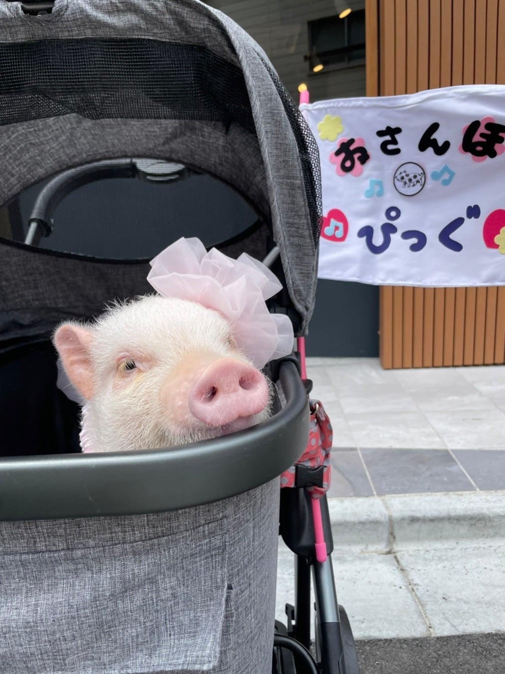 お姫様のフォーマルドレスに身を包み、「おさんぽぴっぐ」の旗をつけたpigちゃんがバギーに乗り、渋谷の街を歩きます。