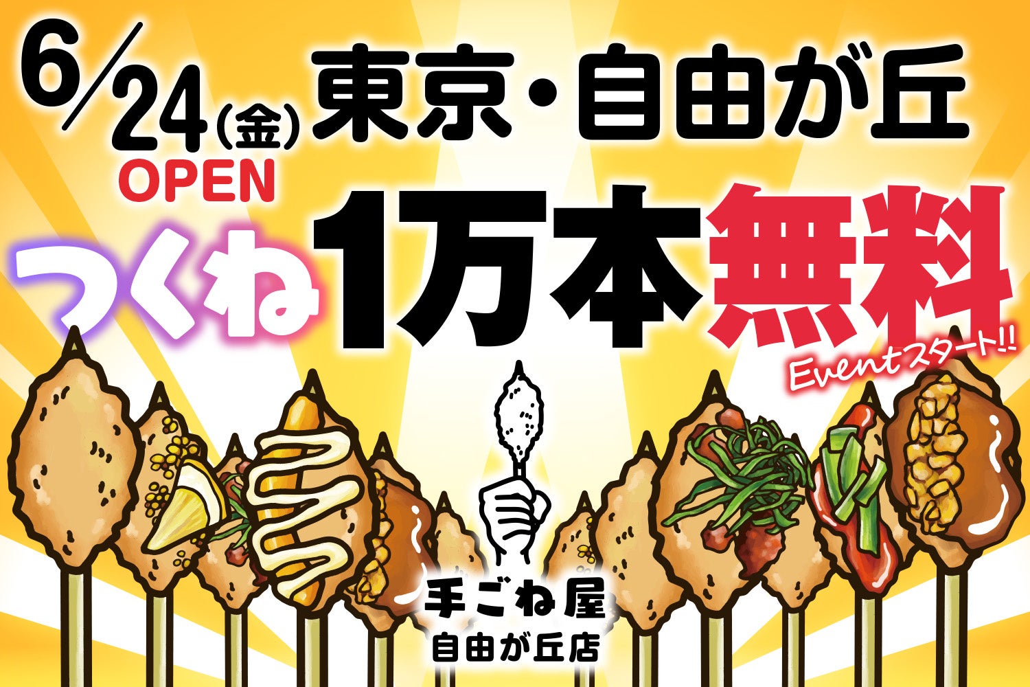 株式会社大庄(東京都大田区、代表取締役社長 平了寿)は、2022年6月24日(金)、東京・自由が丘駅北口から徒歩1分の立地に“カワイイつくね酒場”『手ごね屋』自由が丘店をオープンします。新店舗のオープンを記念して『自慢のつくね10000本無料大放出!』イベントを実施します。このイベントは、渋谷1号店(2021年6月オープン)の開店時にも実施しSNSなどで大きな反響を呼び「神イベント!」と話題になりました。この度、2号店となる自由が丘店でもオープン日の24日17時より、先着順にて44種のつくねと鉄板つくね3種の全47種を10000本に達するまで無料にて提供します。ひとりでもグループでも、本数制限なし、制限時間なしの無制限。しかも、何度来店しても無料です。