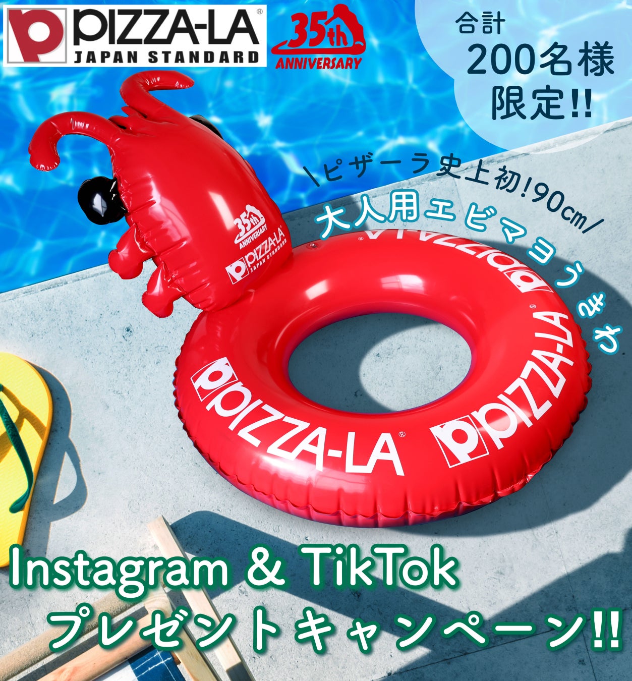株式会社フォーシーズ(本社:東京都港区南青山 代表取締役社長:淺野幸子)が展開する宅配ピザ「PIZZA-LA」は、35周年を記念したSNSでのプレゼント企画 第4弾として、Instagram・TikTokのピザーラ公式アカウントにて各100名様に、ピザーラオリジナル「エビマヨうきわ」が当たるプレゼントキャンペーンを6月17日(金)から実施いたします。