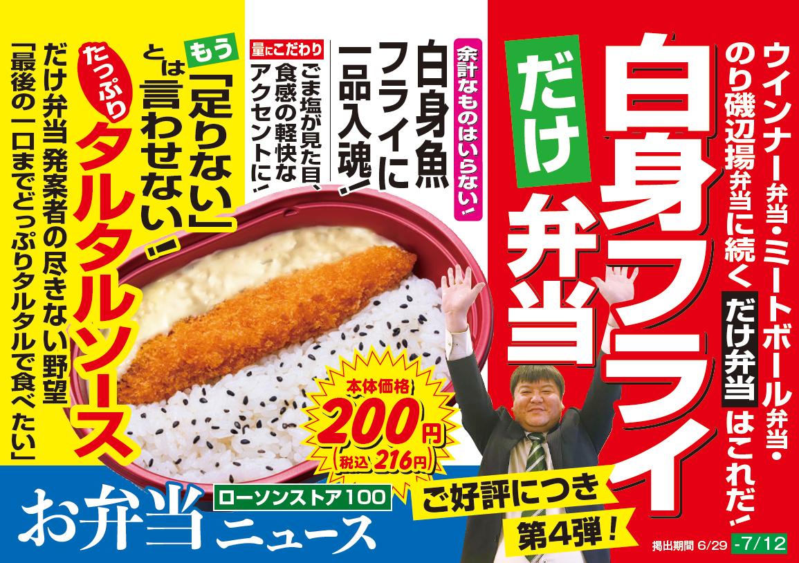 株式会社ローソンストア100(神奈川県川崎市)は、おかずが1つだけの「だけ弁当」シリーズ第4弾として、おかずは白身フライだけの「白身フライ弁当(税込216円)」を2022年6月29日(水)より、全国の「ローソンストア100」(668店舗/2022年5月末現在)にて発売します。