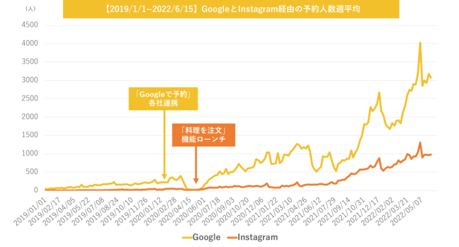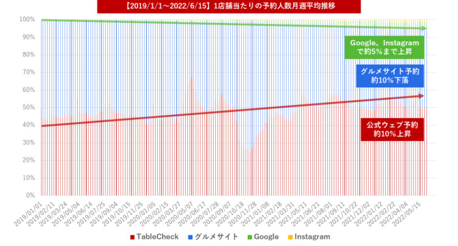 一方、予約比率が増加しているのが、公式ウェブ予約とGoogle、Instagramです。公式ウェブ予約の比率はコロナ前は40%強で推移していましたが、直近ではその比率を50%前後まで上昇させています。Google、Instagram両社は、コロナ禍で飲食店予約機能を充実させて以降、いずれも予約数を急速に伸ばしています。全体的な割合としては両社合わせて5%ほどと、まだ低い割合ですが、グルメサイト離れが進む昨今、この割合は今後さらに急増していくと考えられます。
