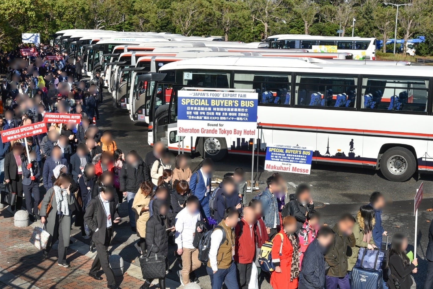 ▲バスから降りて会場に向かう海外バイヤー(2019年“日本の食品”輸出EXPOでの様子)