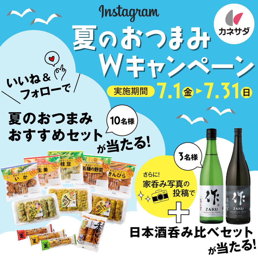 なお、カネサダ公式Instagramでは、磯辺揚など夏のおつまみセットのプレゼントキャンペーン(@kanesada_nelicatessen)「いいね&フォローキャンペーン」と「カネサダ商品で乾杯!家呑みおつまみ投稿キャンペーン」を7月1日(金)から31日(日)まで開催いたします。この機会にぜひご応募ください。