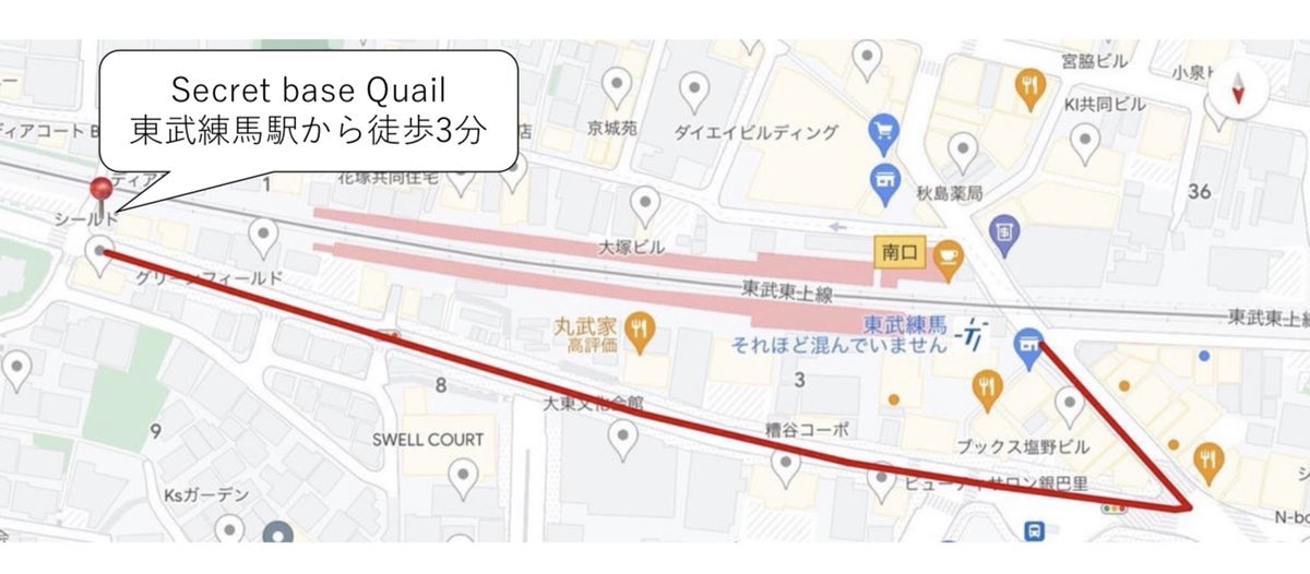 私たちの拠点となるカフェ『Secret base Quail』(シークレットベース クウェイル)は東武練馬駅から徒歩3分とアクセスしやすい場所になっています。