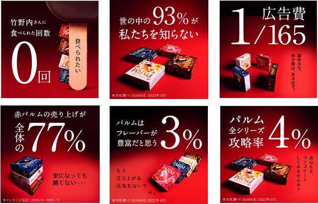 「PARM(パルム)」は、2005年発売のなめらかでコクのあるアイスと口どけのよいコーティングを組み合わせたバーアイスです。赤いパッケージでお馴染みの「PARM(パルム)チョコレート」をはじめ、様々なフレーバーを展開している「PARM(パルム)」ですが、自社の独自調査により、定番の「チョコレート」以外のフレーバー商品「PARM(パルム)チョコレート&チョコレート ~厳選カカオ仕立て~」「PARM(パルム)キャラメルラバーズ」「PARM(パルム)アーモンド&チョコレート」「PARM(パルム)ストロベリー」のマルチパック4商品をすべて知っている方はわずか7%(※1)と判明しました。彼らの認知拡大のために、2022年6月20日(月)から広告を展開します。