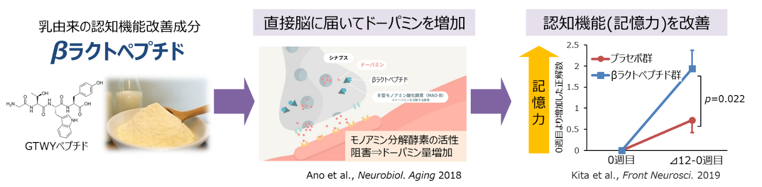 当社は、食事と認知症発症に関する久山町(福岡県糟屋郡)での疫学調査※1に着目し、乳製品に含まれる認知機能を改善する有効成分を探索し、βラクトペプチドを独自に発見しました。βラクトペプチドは、摂取後に血液脳関門を通過し、脳へ届いてモノアミン※2分解酵素の活性を阻害することで、記憶力や意欲に関わる神経伝達物質のドーパミンを増加させます※3。さらに、健常な中高年齢者を対象とした臨床試験によって、βラクトペプチドの摂取が記憶力や集中力等の認知機能を改善すること※4、前頭前野の脳血流を高めること※5を確認しています。当社は、これら一連のエビデンスに基づき、βラクトペプチドを活用した機能性表示食品の事業化を実現しました。また、βラクトペプチドの一連の研究成果は日本認知症予防学会よりグレードAのエビデンス認定を受けています。