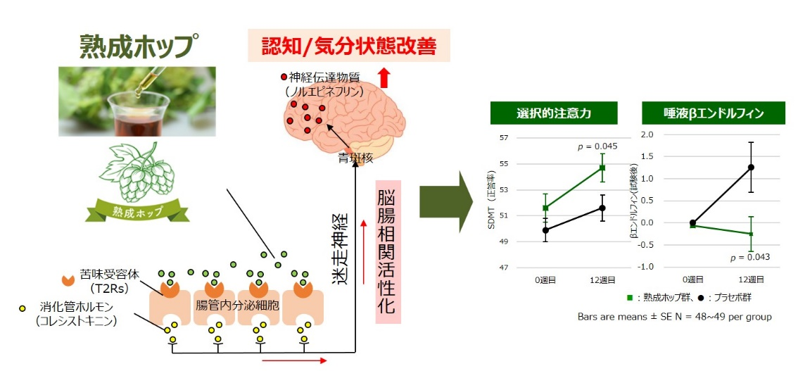 また、当社は、「熟成ホップ」に含まれるビール苦味成分を、認知機能を改善する成分として独自に発見しました。「熟成ホップ」に含まれるビール苦味成分は腸管の苦味センサー(苦味受容体)に働きかけて迷走神経を刺激し、脳と腸を繋ぐネットワーク(脳腸相関)を活性化することで認知機能や抑うつ状態を改善することを確認しています※6。特に、苦みが低減された「熟成ホップ」を用いて健常な中高年齢者を対象とした臨床試験を行い、注意の制御機能、不安感が改善すること※7を確認しました。当社は、これら一連のエビデンスに基づき、熟成ホップを活用した機能性食品の事業化を実現しました。