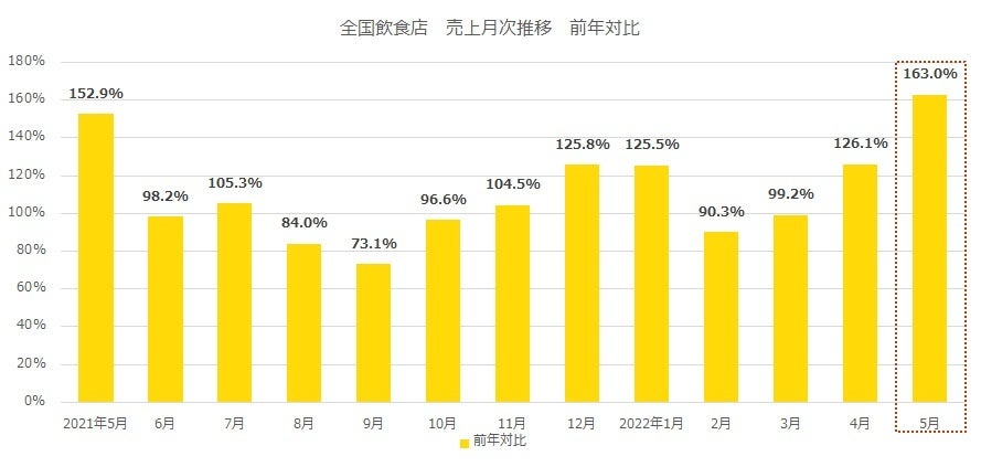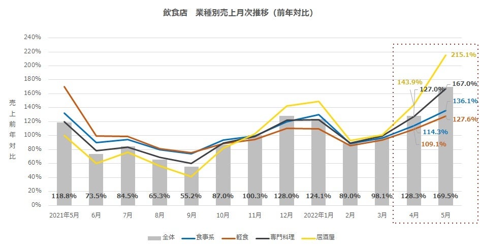 5月は全ての業種で前年対比で回復。特に居酒屋の回復率が高い。