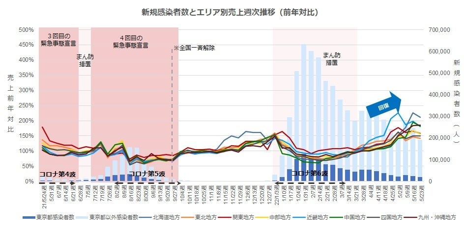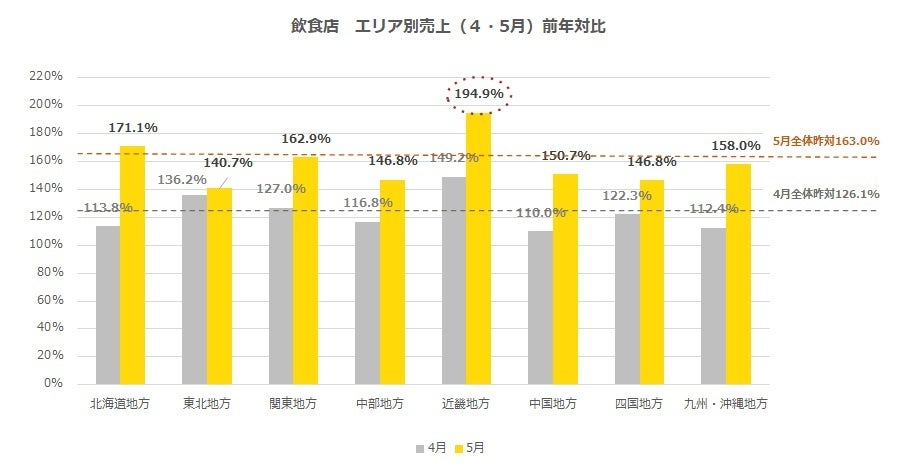 - 5月は4月以上に全エリアで前年以上に大きく伸長。近畿地方での5月の回復率が最も高い。
