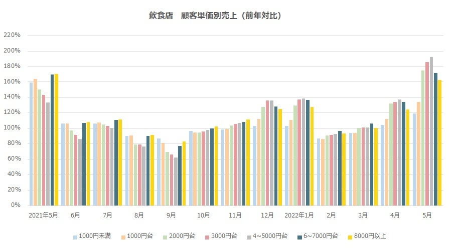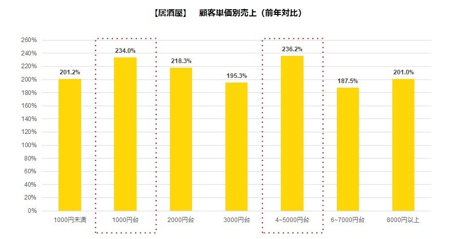 - 顧客単価別でみると、2,000円台~7,000円台で前年対比で130%の伸長を示している。