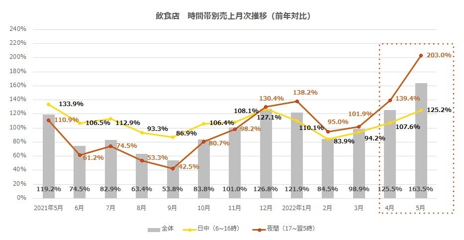 - 5月度の時間帯別売上は、日中帯の前年対比が125.2%、夜間帯が203%。4月度以上に夜間帯の回復が著しい。 (日中=6~16時、夜間=17~翌5時)