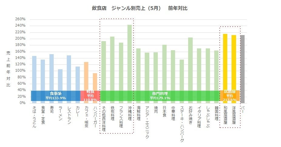 - ジャンル別で見ると、前述の居酒屋のほかには「沖縄料理」「その他西洋料理」「鉄板料理」などの回復率が平均以上である。一方、「ハンバーガー」・「カレー」等の回復率は微減か横ばいである。 4月度の傾向以上に、複数人で楽しむディナー系で大きく回復し定着したと言っていいだろう。